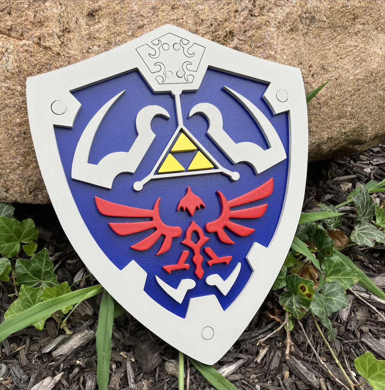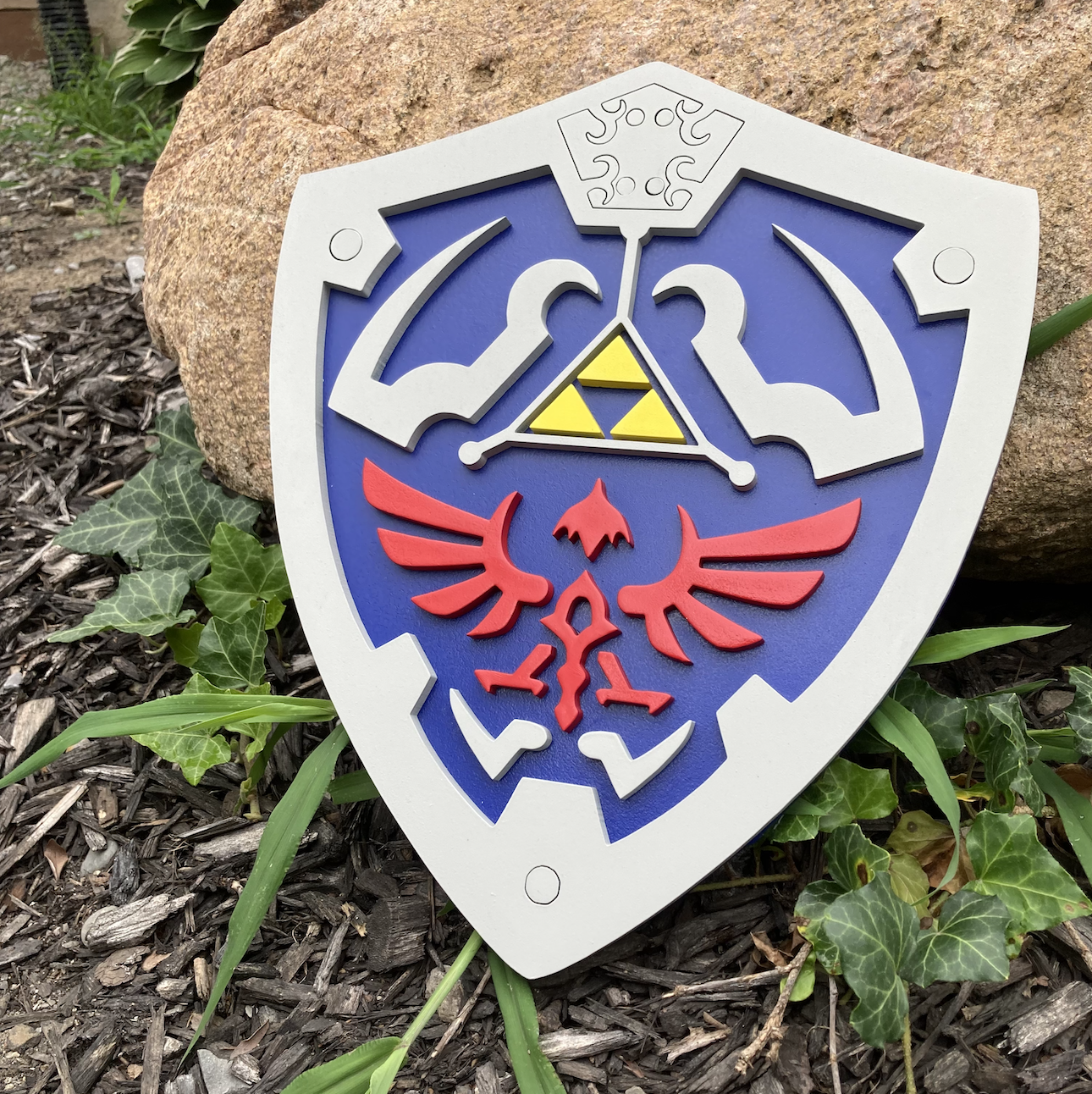 Link's Hylian shield from the videogame franchise. This sign is a perfect addition to any fan's shrine.